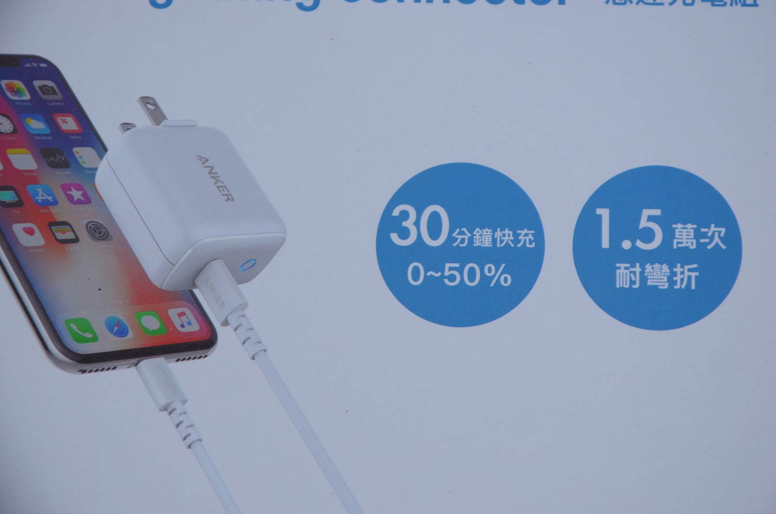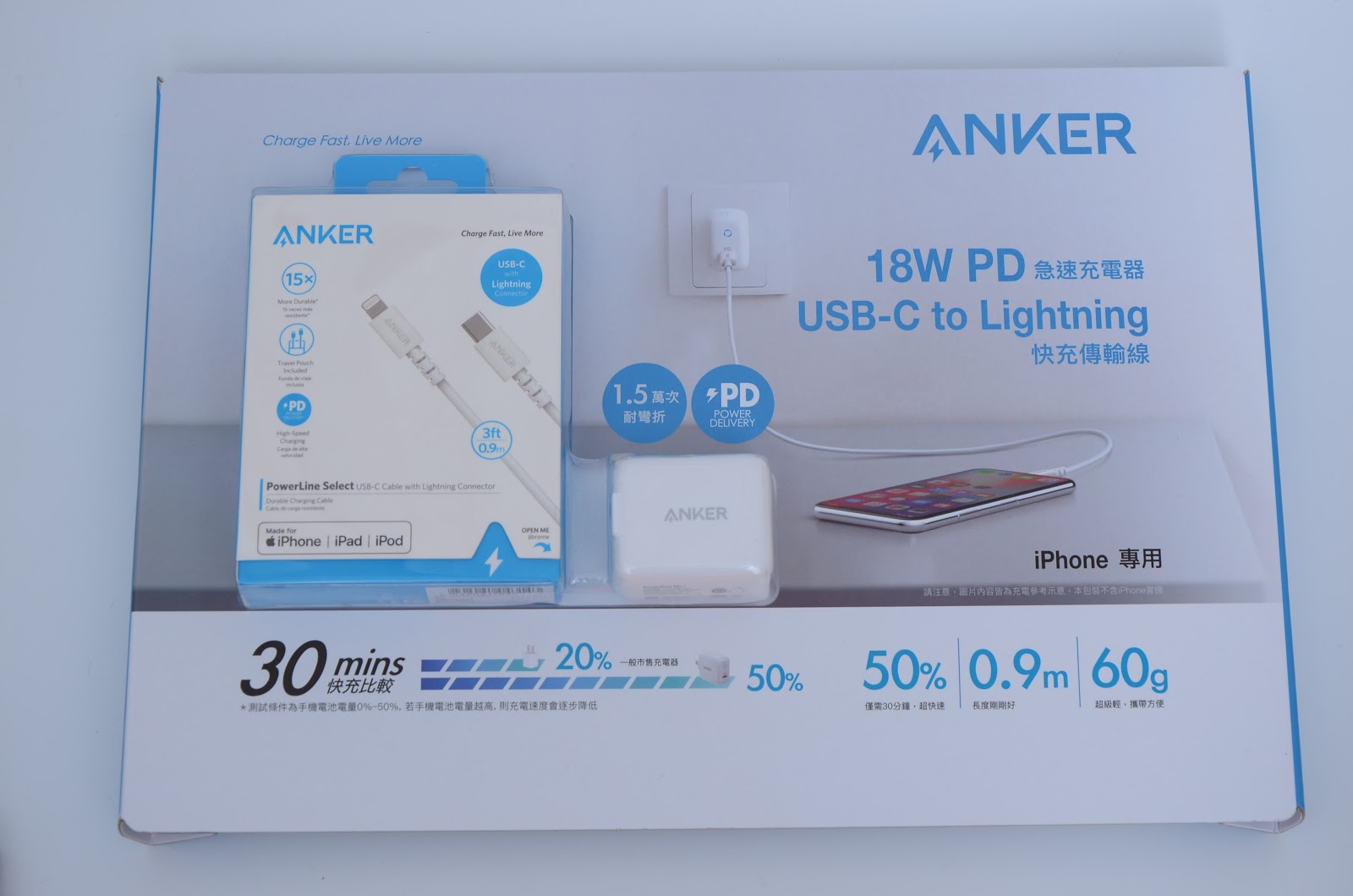 目前因為iPhone的限制,快充只能在電量50%以下才能達到最高瓦特數,也就是電量在50%以下,會自動判斷,在30分內充到50%以上,然後就慢慢降低速度。